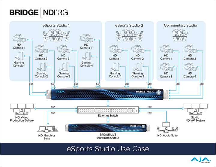 BRIDGE NDI 3G eSports 사용 사례는 바쁜 스튜디오 설정의 중심에 있는 BRIDGE NDI 3G를 보여줍니다. 2개의 스튜디오에서 4인 경쟁 이벤트의 비디오 피드를 제공하고 있습니다. Studio 1은 4명의 게이머에게 각각 2개의 비디오 출력을 제공합니다. 하나는 HD 카메라용이고 다른 하나는 AJA의 HA5 미니 컨버터를 사용하여 HDMI에서 SDI로 변환된 비디오 게임 콘솔의 출력입니다. 총 8개의 비디오 피드가 BRIDGE NDI 3G에 제공되며, 이는 차례로 이러한 피드를 NDI로 인코딩합니다. Studio 2는 HDMI에서 SDI로 변환된 비디오 콘솔 출력뿐만 아니라 각 플레이어에 대한 비디오 피드와 함께 일대일 콘테스트를 제공합니다. 4개의 SDI 비디오 피드는 BRIDGE NDI 3G 후면의 3G-SDI 포트에 직접 연결됩니다. 해설 스튜디오에는 4대의 HD 카메라로 덮인 4명의 발표자가 있습니다. 이러한 3G-SDI 카메라 피드는 BRIDGE NDI 3G에도 연결됩니다. BRIDGE NDI 3G는 NDI 생산 시설 LAN을 통해 공유되는 16개의 비디오 소스 각각에 대한 NDI 피드의 실시간 인코딩을 제공합니다. 스튜디오 1 및 2 비디오 피드는 LAN에서 해설 스튜디오로 다시 접을 수 있습니다. NDI 프로덕션 갤러리의 최종 혼합 출력은 모든 NDI 대상과 공유할 수 있습니다. 이 경우 혼합 및 편집된 출력을 AJA BRIDGE LIVE를 통해 스트리밍 서비스로 가져옵니다. 임베디드 오디오는 BRIDGE NDI 3G에 대한 각 SDI 비디오 피드에 사용됩니다. BRIDGE NDI 3G는 NDI 라이브 프로덕션을 SDI 카메라 및 변환된 게임 콘솔 피드에 연결하는 쉬운 방법을 제공하여 16개의 다양한 SDI 소스에서 파생된 고품질 인코딩 NDI 출력을 제공합니다.