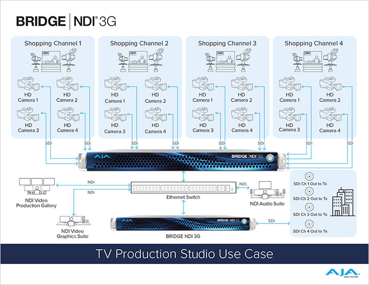 여기에서 우리는 대형 TV 채널 카메라 시스템, 스튜디오당 4대의 HD-SDI 카메라를 볼 수 있습니다. 이 경우 쇼핑 채널 콘텐츠를 다룹니다. 스튜디오당 두 명의 발표자의 오디오가 포함됩니다. 총 16개의 스튜디오 피드는 BRIDGE NDI 3G 후면의 3G-SDI 포트에 직접 연결됩니다. 이 16개의 피드는 NDI 지원 생산 시설 내의 LAN 연결 제품군에 대해 실시간으로 NDI 소스로 인코딩됩니다. 모든 피드는 각 NDI 제품군에서 액세스할 수 있으므로 LAN을 통해 각 스튜디오의 최종 혼합 출력에 기여할 수 있습니다. 이렇게 혼합된 NDI 출력은 NDI 소스를 직접 디코딩하는 다른 BRIDGE NDI 3G의 SDI 출력을 통해 전송 시설로 전달됩니다.
