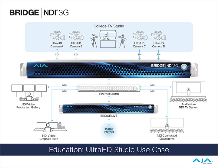 BRIDGE NDI 3G Education 사용 사례는 UltraHD가 장착된 College TV Studio를 보여줍니다. 4대의 UltraHD 카메라는 쿼드 링크 3G-SDI를 BRIDGE NDI 3G의 SDI 입력으로 출력합니다. BRIDGE NDI 3G는 비디오를 NDI로 인코딩하고 College LAN(Local Area Network)을 통해 이를 공유합니다. College LAN에는 UltraHD NDI 비디오 피드를 모니터링하고 실시간으로 편집 할 수 있는 NDI 비디오 프로덕션 갤러리를 포함하여 다양한 NDI 호환 대상/소스가 있습니다. NDI 소스로 LAN을 통해 NDI 비디오 프로덕션 갤러리로 다시 전달할 수 있는 화면 그래픽의 시각적 믹싱을 위해 스튜디오에서 NDI 비디오를 수신할 수 있는 NDI 그래픽 제품군도 있습니다. 이 파이프라인의 프로그램 콘텐츠 출력은 강의실 및 강당을 포함하여 대학 내의 여러 NDI 지점과 공유될 수 있으므로 강의, 프레젠테이션 및 기타 대규모 행사를 고품질로 쉽고 실시간으로 공유할 수 있습니다. 마지막으로 AJA BRIDGE LIVE는 프로그램 NDI 콘텐츠 출력을 가져오고 이번에는 고품질 H.265의 UltraHD 인터넷 스트리밍을 위한 또 다른 공유 지점을 제공합니다. 임베디드 오디오는 TV 스튜디오 UltraHD 비디오 피드에 사용됩니다. BRIDGE NDI 3G는 표준 LAN 인프라에서 가장 까다로운 비디오 형식과 오디오를 공유할 수 있고 상시 켜져 있는 소형 솔루션을 제공합니다.