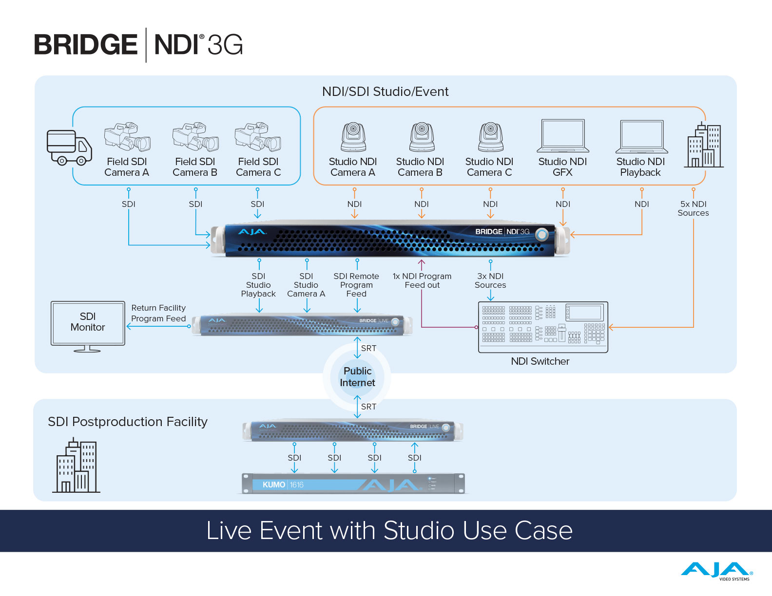 이 BRIDGE NDI 3G 사용 사례는 BRIDGE NDI 3G가 어떻게 동시에 인코딩/디코딩을 위한 중앙 허브가 될 수 있는지 보여주며, 변환의 backbone을 제공하여 NDI에서 SDI로의 변환기와 SDI에서 NDI로의 역할을 합니다. 3개의 필드 카메라가 스포츠 이벤트에 배치되며 SDI 케이블로 BRIDGE NDI 3G에 연결됩니다. 동시에 경기장의 한 스튜디오에서는 3대의 NDI 카메라를 포함하는 5개의 NDI 소스, NDI 소스로서의 Studio 온 스크린 그래픽 및 Studio NDI 재생도 제공하고 있습니다. BRIDGE NDI 3G는 3개의 SDI 카메라를 NDI로 인코딩하고 NDI 스위처로 전달됩니다. 이 NDI 스위처는 스튜디오에서 5개의 NDI 소스도 수신합니다. BRIDGE NDI 3G는 NDI 스위처의 전환된 프로그램 출력을 인코딩하고 Studio Playback 및 Studio Camera A와 함께 SDI를 통해 AJA BRIDGE LIVE로 전달됩니다. AJA BRIDGE LIVE는 소스를 SRT를 통해 H.265로 인코딩하는 작업을 처리합니다. 그런 다음 공용 인터넷을 통해 다른 AJA BRIDGE LIVE가 세 가지 스트림 모두에 대한 SDI 출력을 제공하고 시설에서 최종 프로그램의 라이브 이벤트로 최종 반환 피드를 제공하는 SDI 후반 제작 시설로 전달됩니다. BRIDGE NDI 3G는 수행하도록 설정된 작업 조합에 관계없이 고품질 결과를 제공하도록 신뢰할 수 있는 항상 켜져 있는 인코딩/디코딩 장치의 필요성에 응답합니다. BRIDGE NDI 3G는 또한 시설이나 이벤트를 넘어 도달해야 하는 워크플로우를 위해 BRIDGE LIVE의 완벽한 파트너가 됩니다.