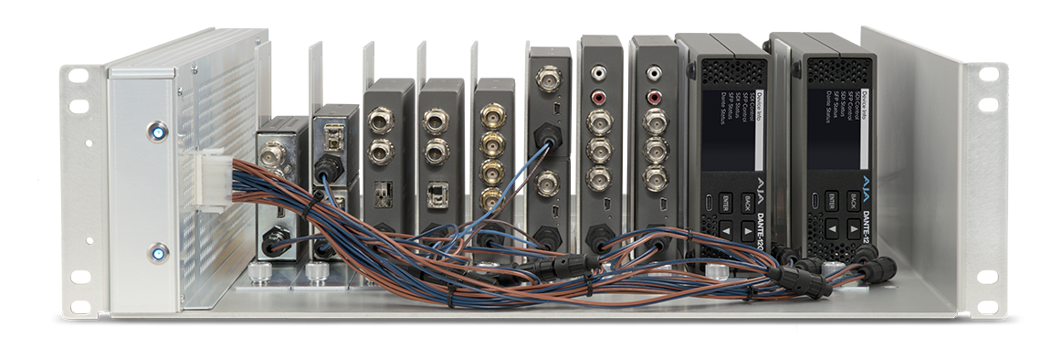 DRM2-Plus는 AJA 미니 컨버터를 보관하고, 전원을 공급하고, 관리하는 데 가장 적합한 솔루션입니다.