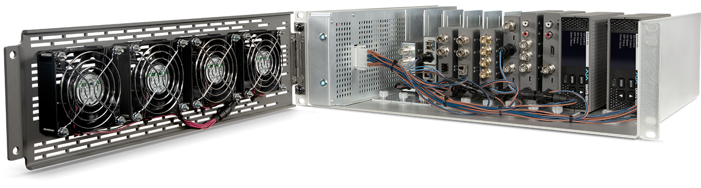 DRM2-Plus는 랙에서 분리하지 않고도 컨버터에 쉽게 접근할 수 있도록 힌지 방식의 전면 패널을 갖추고 있습니다. DRM2-Plus는 AJA 미니 컨버터를 보관, 전원 공급 및 관리하는 데 가장 적합한 솔루션입니다.