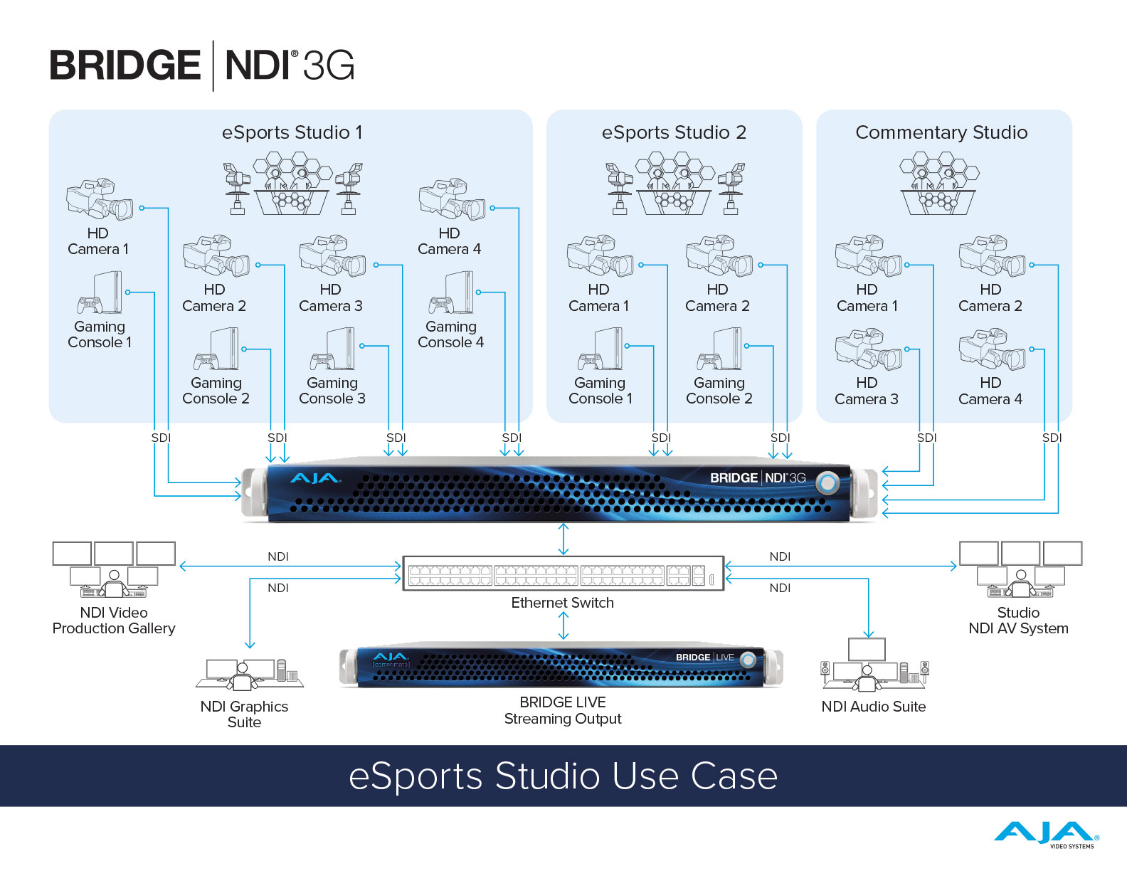 이 사용 사례에서 오디오 피드가 내장된 e스포츠 비디오는 AJA KUMO 3232 SDI 라우터를 통해 4개의 해설 스튜디오로 배포됩니다. 각 해설 스튜디오에는 각 지역마다 각각의 혼합 오디오 트랙을 포함합니다. 각 해설 스튜디오는 SDI 비디오와 새로 내장된 해설 오디오 믹스를 총 4개씩 HELO Plus로 전달하며, 각각은 이더넷 스위치를 통해 서로 연결됩니다. 4개의 HELO Plus 기기가 그룹으로 구성되어 있으며, HELO Plus #1이 리더로 설정되어 있습니다. HELO Plus #1에서 레코드 또는 스트림을 누르면 모든 HELO Plus 장치가 두 가지 대체 형식인 1080p29.97과 720p29.97로 스트리밍하여 그룹의 스트리밍 시작 및 중지를 다양한 스트림에서 동기화된 상태로 유지합니다. 여러 HELO Plus 장치에 걸친 그룹 기능은 표준 인프라에서 쉽게 달성됩니다. 즉, 장치가 물리적으로 서로 가까이 있지 않아도 마치 나란히 연결된 것처럼 작동합니다.