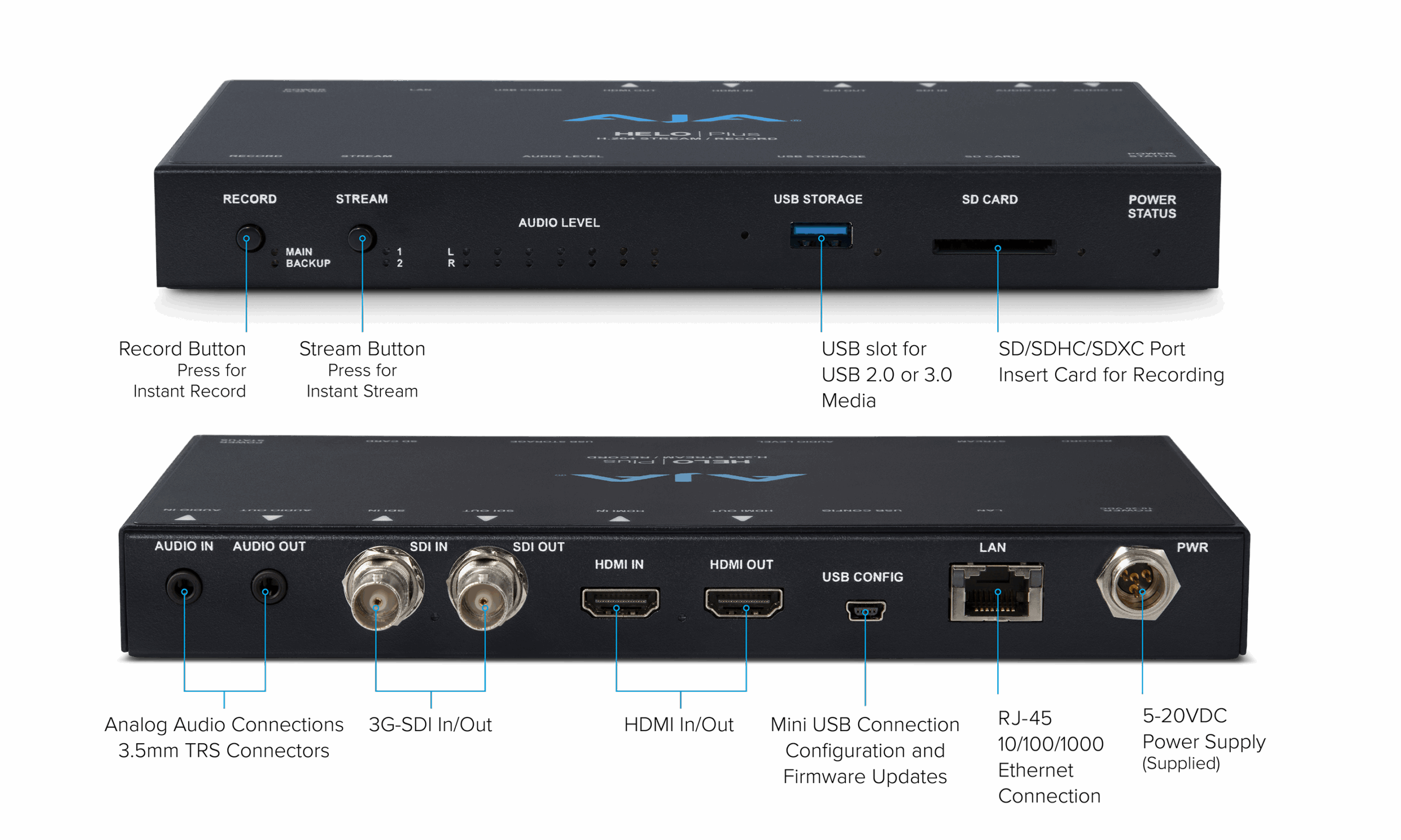 HELO Plus는 데스크탑 설치 공간이 매우 작은 컴팩트한 제품입니다. 장치 전면에 있는 스트리밍 및 레코딩 버튼과 LED 표시기가 있는 독립형 기능을 제공하며, 오디오 레벨 미터는 수신 오디오에 대한 귀중한 피드백을 제공합니다. HELO Plus는 팬이 없고 소음이 없어 거의 모든 곳에서 소음 발생 우려 없이 사용할 수 있습니다. SD 카드 및 USB 포트도 장치 전면에 있어 쉽게 액세스할 수 있습니다.