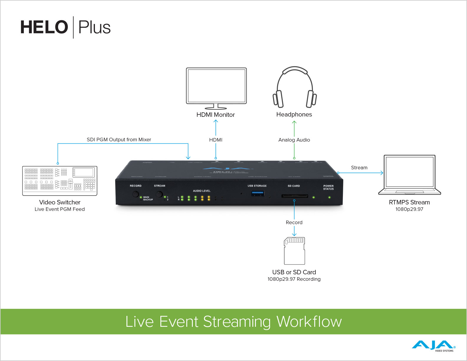 HELO Plus는 HELO Plus를 스트리밍 서비스의 핵심으로 만드는 데 필요한 모든 전문 디지털 I/O를 제공합니다. 액세스하기 쉬운 전면 패널 버튼으로 스트리밍 시작 및 정지가 간단합니다.