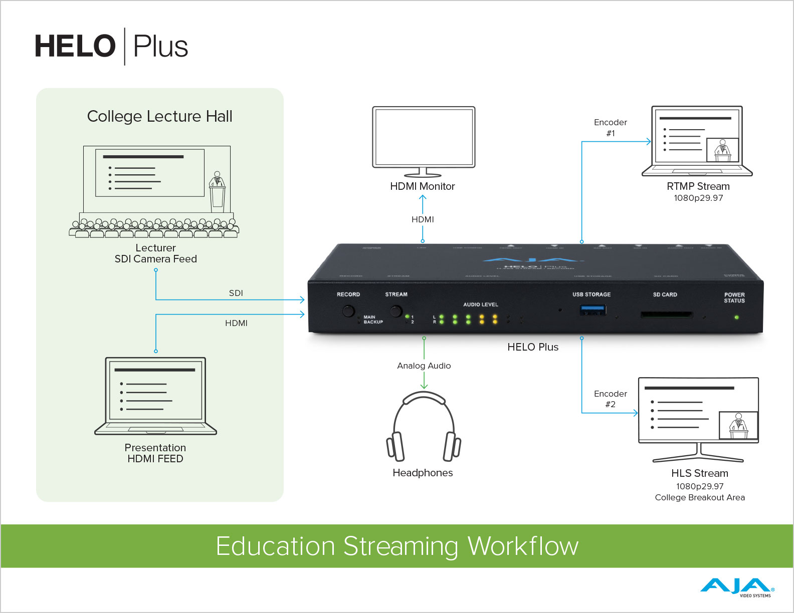 이 사용 사례에서는 대학 강의가 진행중입니다. HELO Plus는 강사의 SDI를 통해 비디오를 수신합니다. 동시에 강사의 노트북에 대한 프레젠테이션이 HDMI를 통해 HELO Plus의 HDMI로 출력되고 있으며, HELO Plus 스트리밍 콘텐츠는 HDMI 모니터와 헤드폰을 사용하여 모니터링됩니다. HELO Plus는 PIP(picture-in-picture) 레이아웃을 생성하도록 설정되었습니다. 이 경우 강의자의 비디오는 축소되고 프레젠테이션의 오버레이로 오른쪽 아래 모서리로 이동합니다. 이 사진 결합 출력은 두 인코더로 전달되며, 첫 번째 인코더는 RTMP를 통해 시설 외부의 학생들을 위한 스트림을 제공합니다. 동시에 두 번째 인코더는 대학 브레이크아웃 영역으로 전달하기 위해 HLS를 활용합니다.