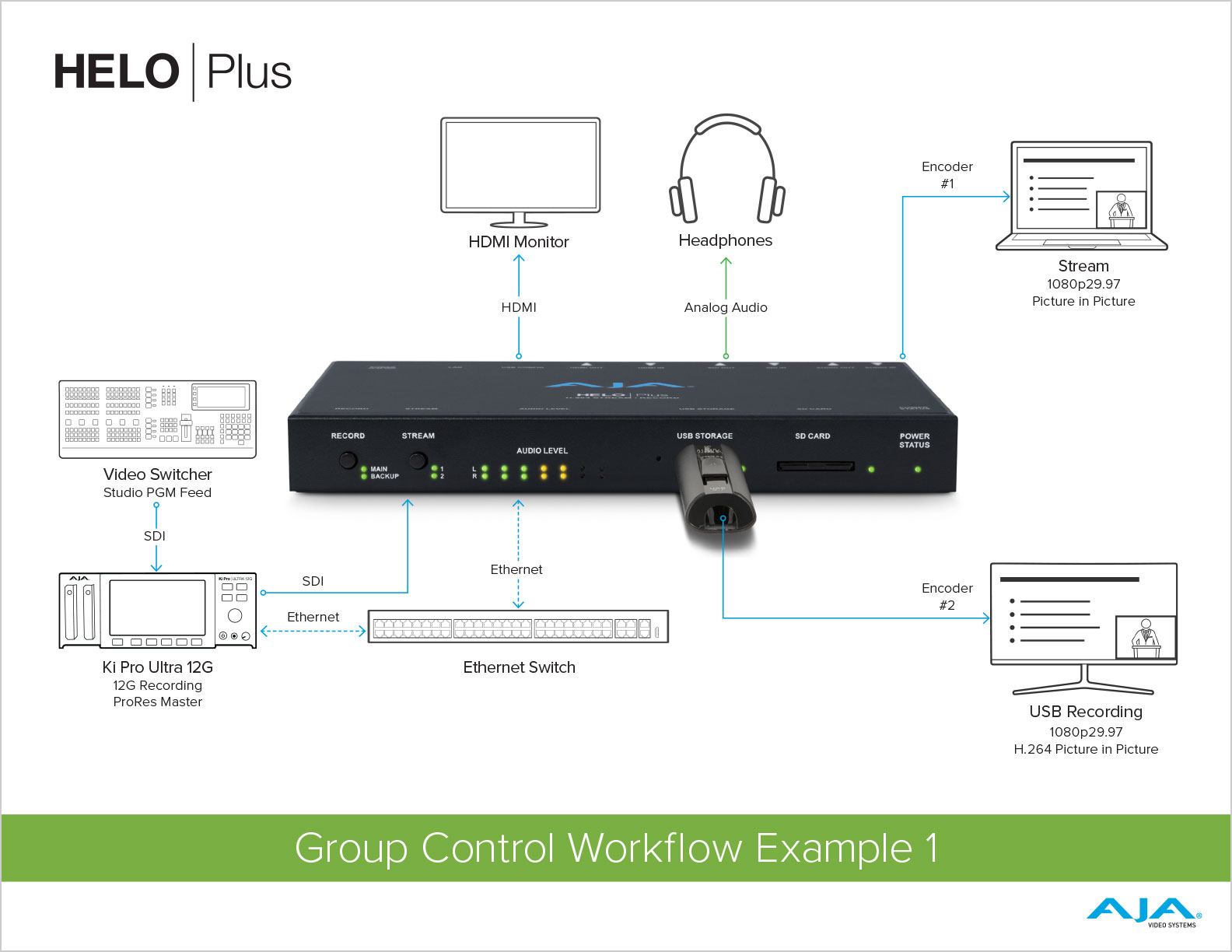이 사용 사례에서 스튜디오 프로덕션의 전환된 비디오 출력은 AJA Ki Pro Ultra 12G에서 ProRes 마스터로 기록됩니다. Ki Pro Ultra 12G는 SDI를 통해 HELO Plus로 비디오와 오디오를 전달합니다. HELO Plus는 프레임 스토어에서 제공하는 복합 배경과 함께 축소된 프로덕션 비디오를 보여주는 레이아웃으로 구성됩니다. Ki Pro Ultra 12G 및 HELO Plus는 Ki Pro Ultra 12G를 리더로 하여 그룹으로 구성된 동일한 이더넷 네트워크에 연결됩니다. Ki Pro Ultra 12G에서 레코딩을 하면 HELO Plus가 스트리밍과 USB 레코딩을 동시에 시작합니다. HELO Plus를 다른 AJA 비디오 장치와 그룹화하면 여러 장치에 걸쳐 녹화와 스트리밍을 동시에 수행할 수 있는 훨씬 더 정교한 제어가 가능합니다.