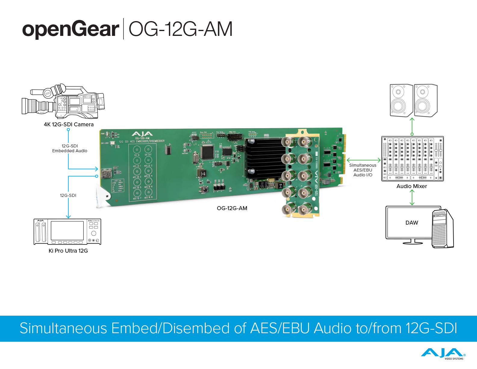 OG-12G-AM은 최대 12G-SDI 입력 및 출력을 지원하는 16채널 AES/EBU 오디오 임베더/디스임베더 openGear 카드이며, 최대 4K/UltraHD를 지원합니다.