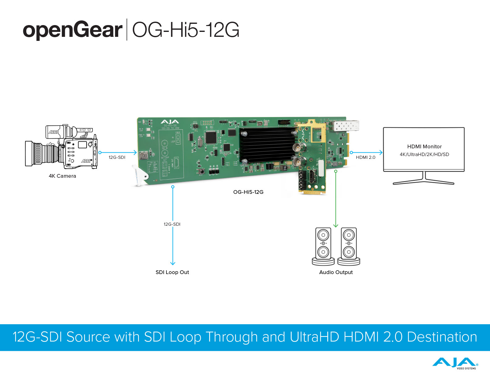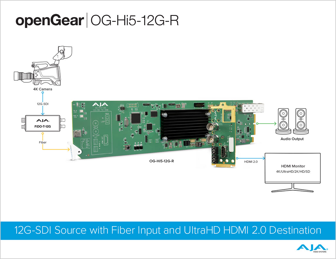 OG-Hi5-12G는 12G-SDI를 HDMI 2.0으로 변환하여 선명한 이미지 충실도와 4K/UltraHD에 대해 최대 60p의 HFR을 지원하는 인기 있는 openGear 폼 팩터로 제공됩니다. OG-Hi5-12G는 전문가용 4K 12G-SDI 장치에서 HDMI 2.0 입력이 있는 장치로 모니터링 연결을 쉽게 구축할 수 있습니다. 또한 OG-Hi5-12G는 HDMI v2.0 및 CTA-861-G에 따라 HDR 메타데이터를 생성할 수 있습니다.
